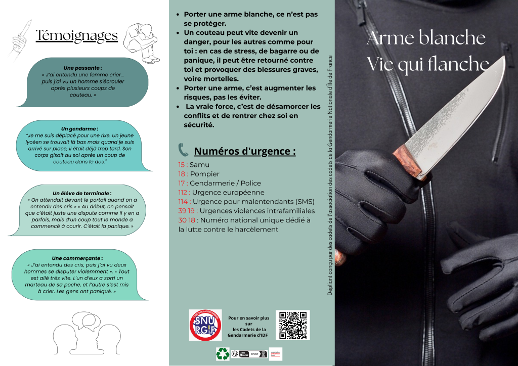 Nos Cadets se sont retrouvés samedi 11 avril 2026 pour sensibiliser des jeunes de 14 à 18 ans (et leur entourage) sur les problématiques et risques liés au port d’armes blanches, que ce soit au collège, au lycée, ou sur la voie publique